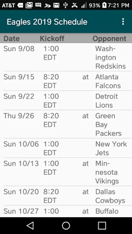 Carry the entire Philadelphia Eagles’ regular-season football schedule with you at all times with this app. Includes date and time of kickoff, opponent and whether the game is home or away. Just the essentials, no filler.
