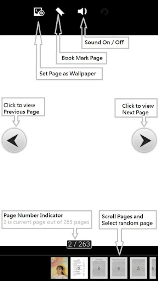 • Every page has its small thumbnail which is listed bottom horizontally on the buttons "Previous" and "Next” or only
