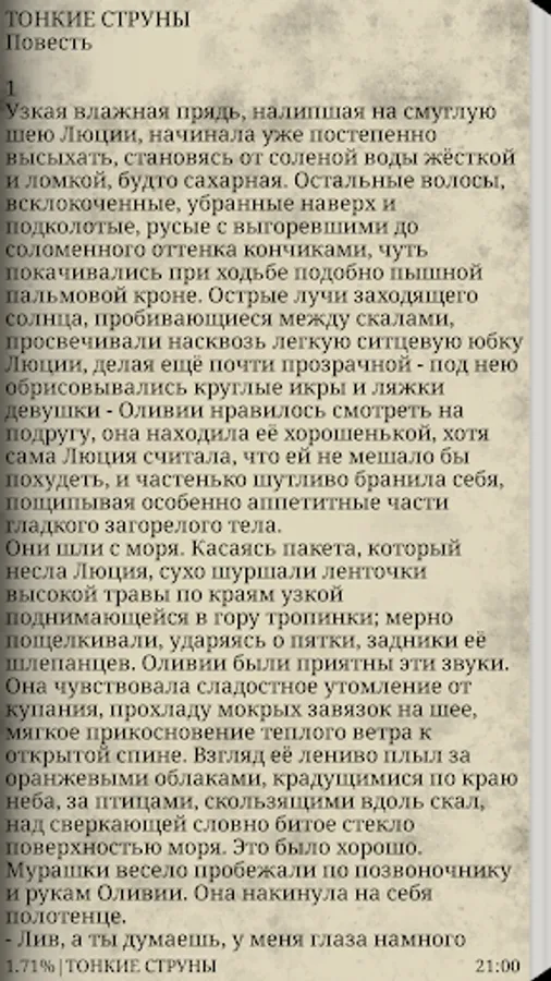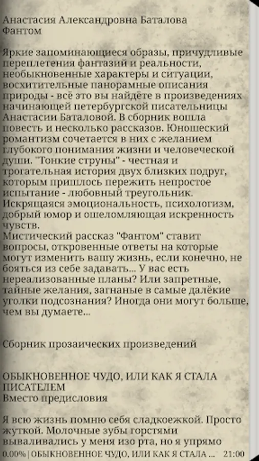 Bright memorable images, fancy weave fantasy and reality, unusual characters and situations, breathtaking panoramic description of nature - all this you will find in the works of St. Petersburg aspiring writer Anastasia Batalov. The collection includes a story and several short stories. Youthful romance combined with the desire in them a deep understanding of life and the human soul. "Thin string" - an honest and touching story of two close friends who had to go through a difficult test - a love triangle. Sparkling emotionality, psychology, good humor and a stunning sincerity of feelings.