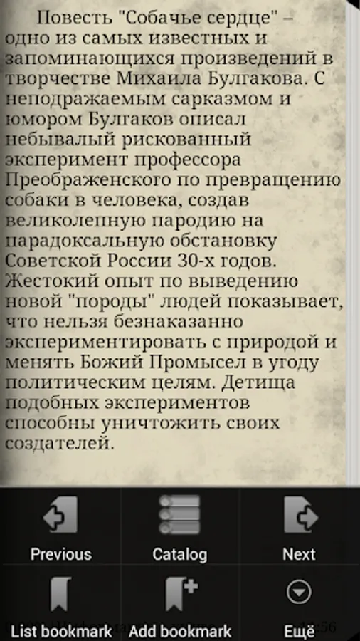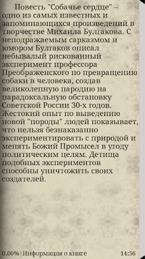 The story "Heart of a Dog" - one of the most famous and memorable works in the works of Mikhail Bulgakov. With inimitable sarcasm and humor Bulgakov described the unprecedented risky experiment by Professor Preobrazhensky dog becoming a human, creating a great parody of the paradoxical situation of Soviet Russia 30s. Cruel experience in the removal of a new "breed" of people shows that we can not with impunity to experiment with nature and change the Divine Providence for the sake of political goals. The brainchild of such experiments can destroy their creators.