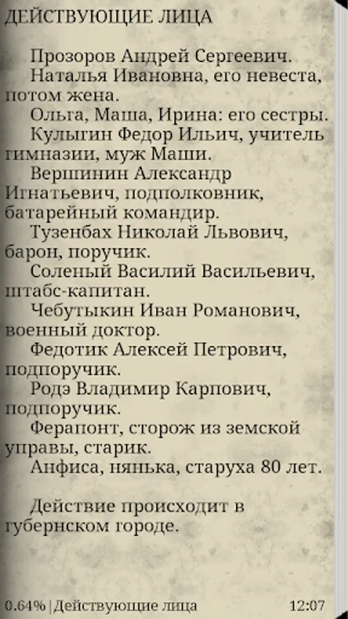 The play "Three Sisters", written in 1900, immediately after the performances on the stage and the first publications caused many conflicting responses and evaluations. Perhaps this is the only piece that gave rise to so many interpretations, disputes that do not cease to this day. "Three Sisters" - a play about happiness unattainable, distant, about waiting for happiness, which the characters live. About futile dreams, illusions, which passes all life, of the future that never comes, and instead continues to the present, joyless and devoid of hope. The play concerned returns to his own private thoughts, forces participate in an event ...