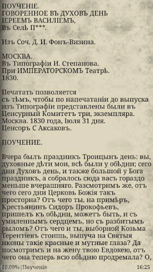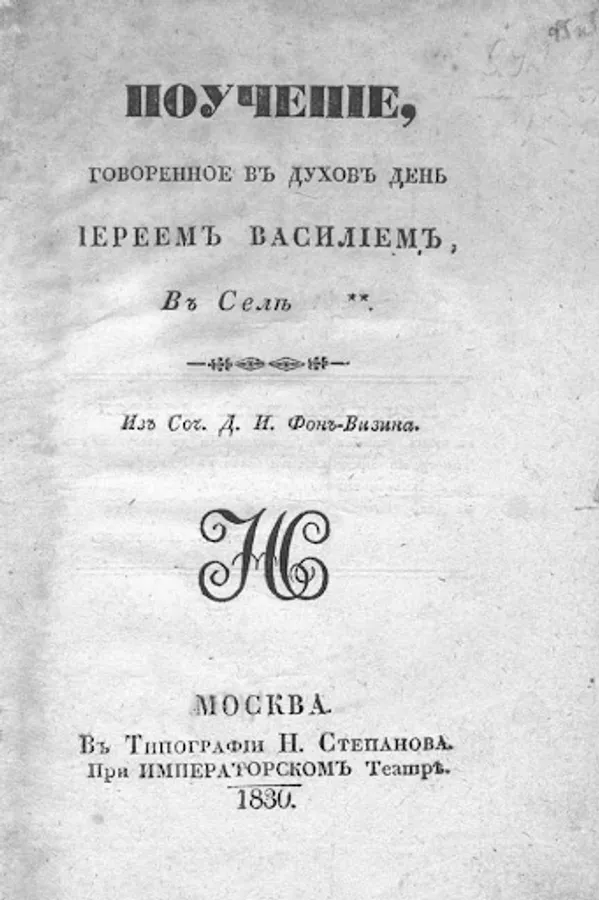 Predstavlyaem Vam satirical proizvedenіe Denis Fonvizin "Pouchenіe, speaking unto Duhov day іereem Vasilіem unto selѣ P ***." It is written cherez nѣskolko lѣt poslѣ posѣschenіya avtorom rural church and hear the tam propovѣdi priest unto a tot prostym yazykom obyasnyal krestyanam of vredѣ chrezmѣrnago vinopitіya.
