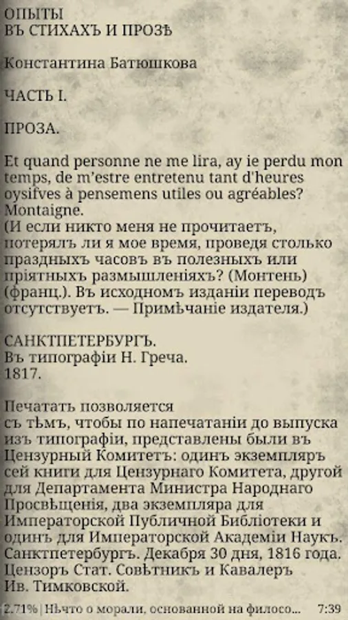 Predstavlyaem Vam article Konstantin Nikolayevich Batiushkov "Nѣchto of morality based on filosofіi and religіi". It is written unto 1815. Unto her avtor kritikuet stoikov, epikureytsev, frantsuzskago philosopher Rousseau, and edinstvennym sredstvom spasenіya schitaet hristіanskuyu religіyu. There mnѣnіe that avtor predchuvstvoval revolyutsіonnyya sobytіya 1825 and feared for Rossіyu that otrazil unto statѣ.