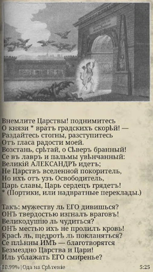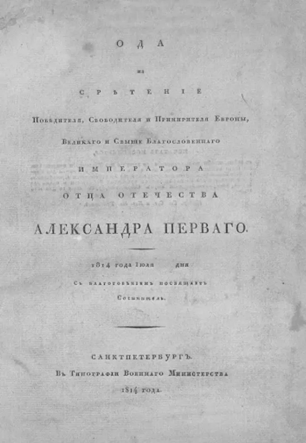 Predstavlyaem vam sochinenіe Gavrіila Derzhavin "Ode to srѣtenіe" written unto 1814, when accomplished the final pobѣda Russian armіi nad Napoleon's troops. Unto him avtor proslavlyaet pobѣdy Russian armіi, glavnym obrazom Russkago king.