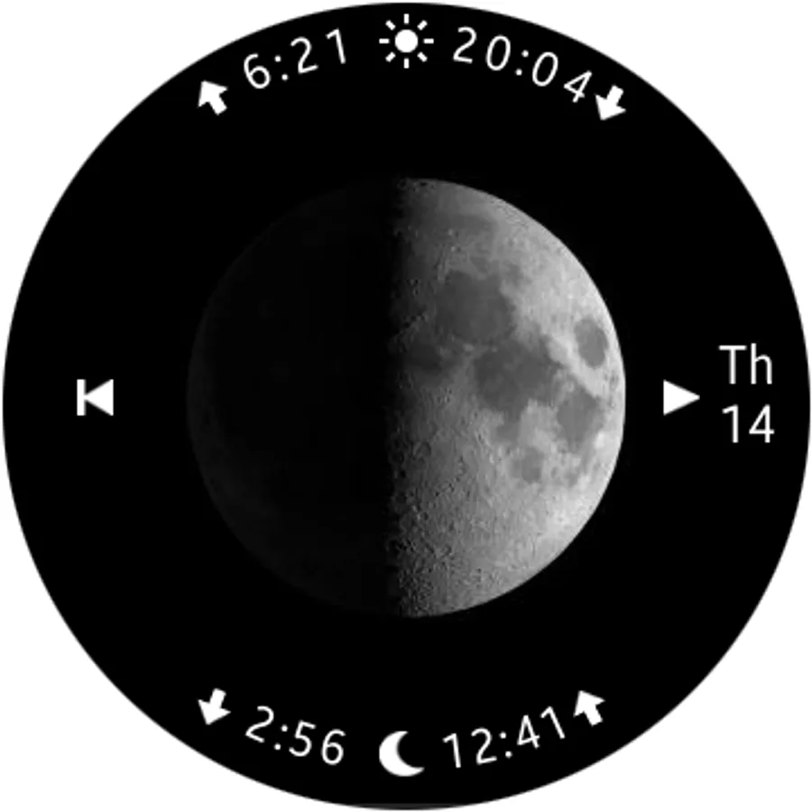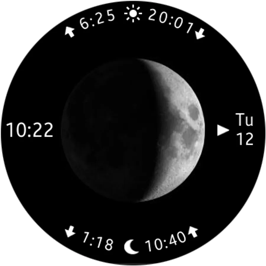Moon Calendar Watch shows moon phases and times of sunrise, sunset, moonrise and moonset.