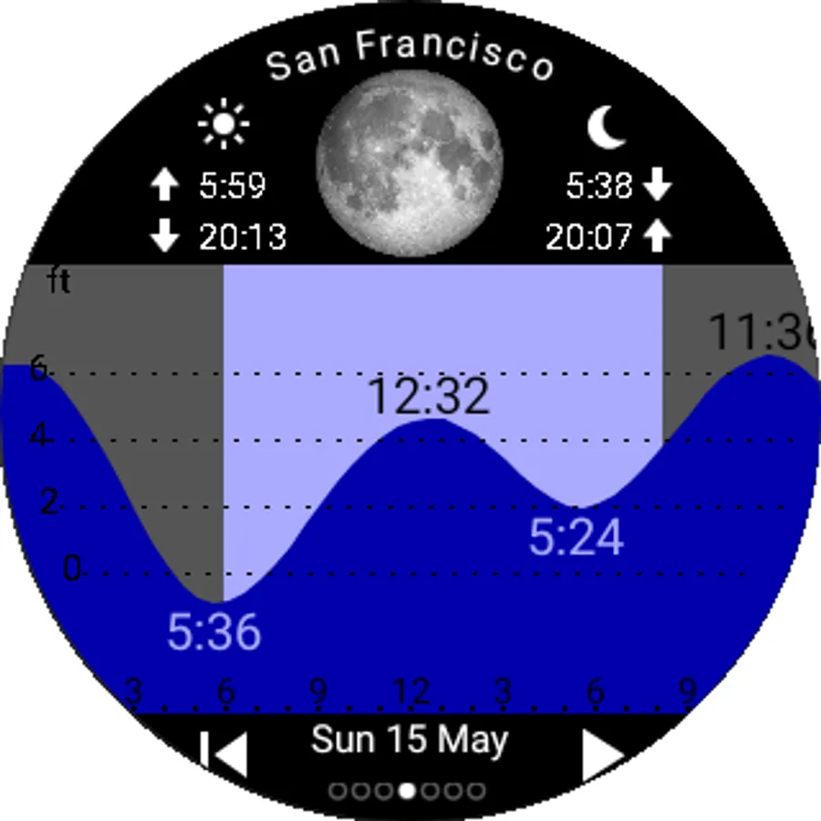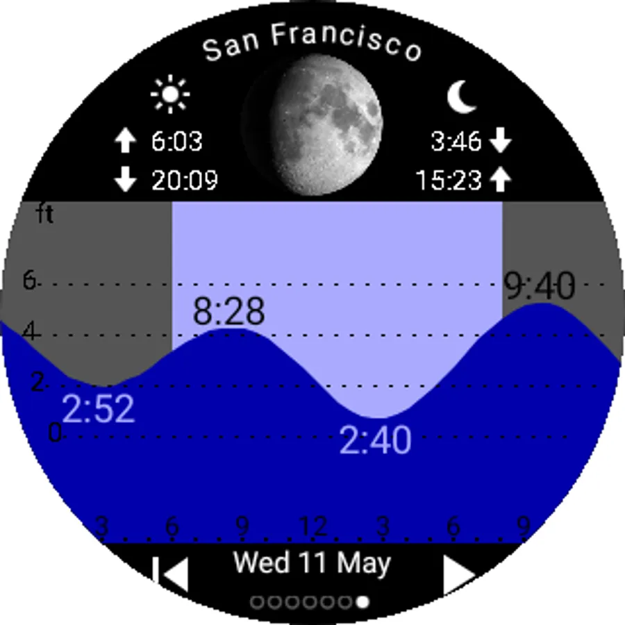Swipe left/right to see the tide chart of the next day or play an animation of moon phase and tide changes to get a quick overview.
