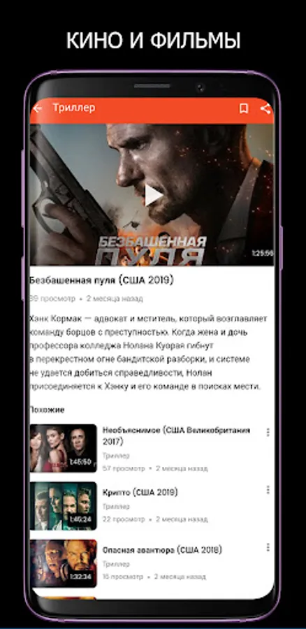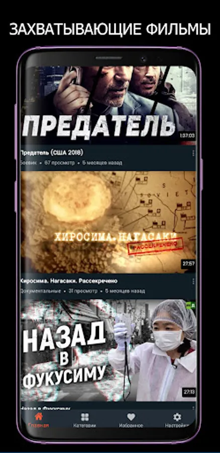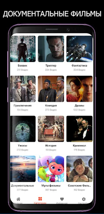 In our application, we have collected a large archive of films by genre. Category section - contains genres such as action, thrillers, historical films, dramas, comedies, etc.
