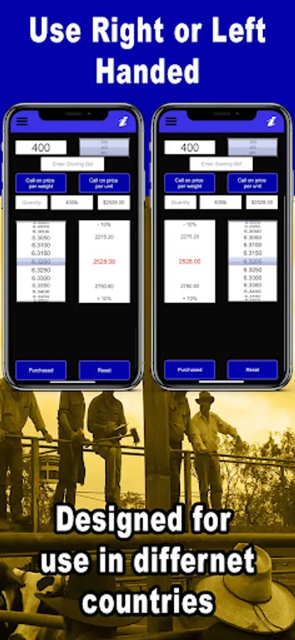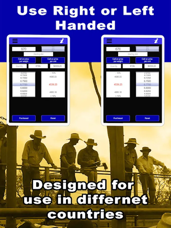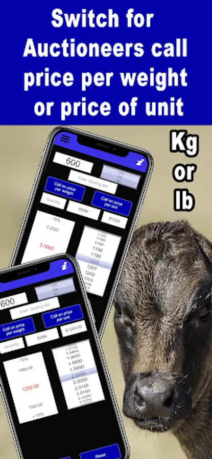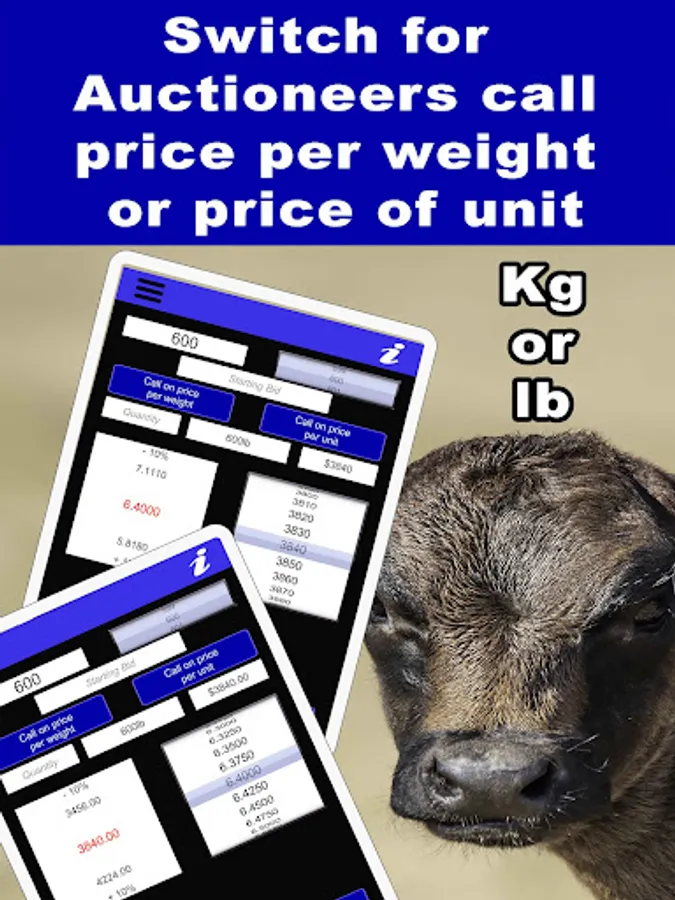 A calculation tool for beef farmers and stock buyers to use at livestock auctions, cattle sale markets or sale barns. The app quickly calculates the price per pound or kilo of livestock lots. The mode can be changed depending on whether the sale auctioneer is calling on cost of beast or price per weight. Incorporating a number wheel to keep up with the auctioneer’s call, the price per pound or kilo is displayed depending on estimated weight of beast with a 10% leeway. This auction bidding calculating app also keeps track of animals purchased along the way. Makes auction calculations easy and fast giving you the advantage at any animal auction or cattle sale. A must for your next visit to the cattle markets. A great livestock buying tool. Works in different currencies. Can be used at all auctioning markets. This cow sales buying app has newly added features for keeping track of the day’s total purchases, weight, and number of head. Sale yards commission can also be factored in to give the cattle bidder a better idea of the cost for each lot.