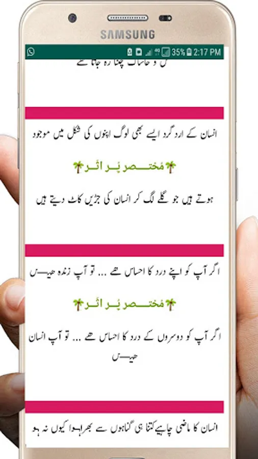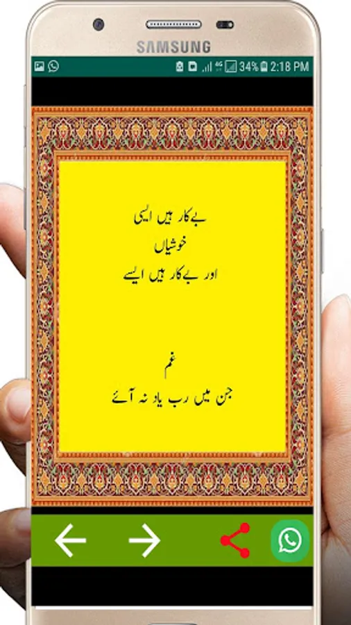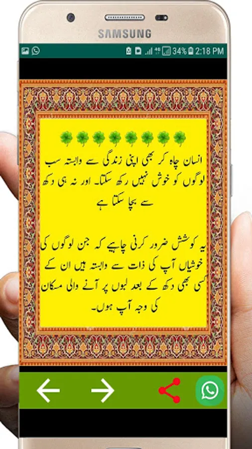 Dosto iss app app mian app wo golden words or sachi , sunari batain apny dosto ko whatsapp kar shktay hai....iss mian share ka option bi majod hai jis say app asani say koi bi golden words ko apny scocail paltform per share kar shktay hai like agher app facebook or whatsapp per status lagna chaty hai tu ya app app ky liya hai....