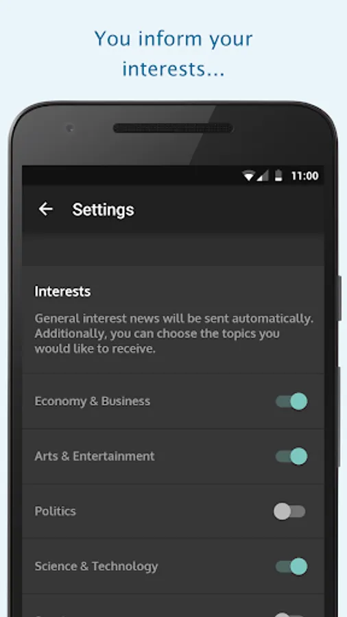 We believe that the news of your interest should find you, not vice versa. So we created the first app with the concept of news delivery. You say what subjects interest you and we push it to you. So simple.