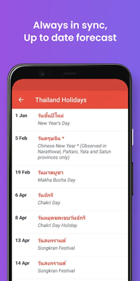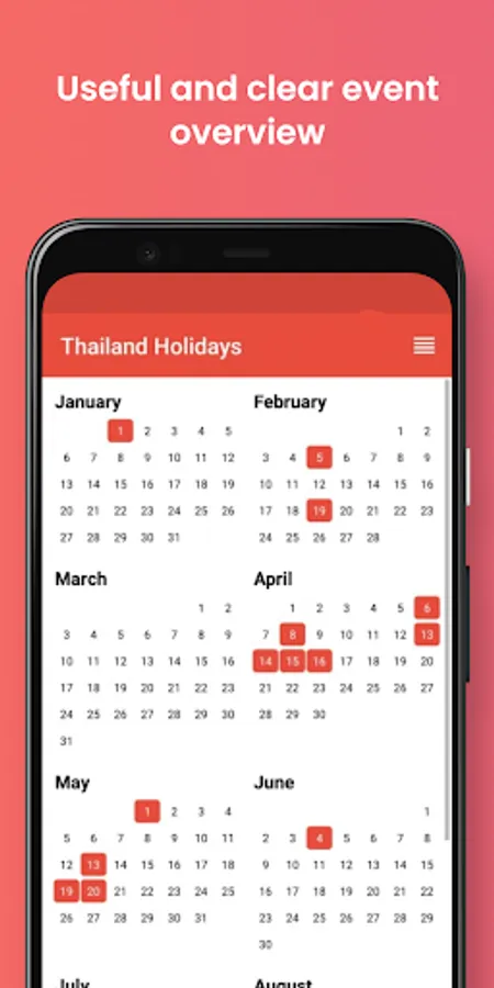 This app is a national calendar of all 2023 public holidays for Thailand. These dates may be modified as official changes are announced, so please check back regularly for updates.