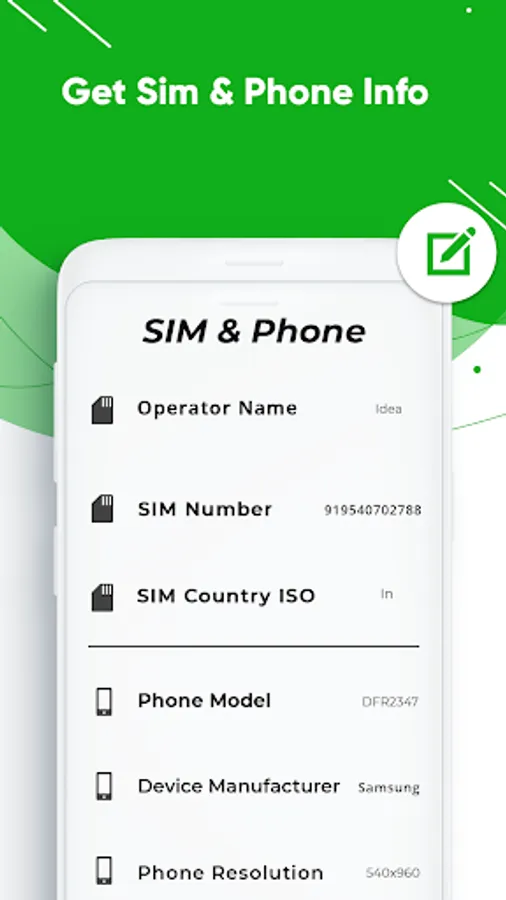 ℹ️Get Device & SIM Info such as SIM operator name, SIM Number, IMEI Number, Model Name, Android Version, Phone Resolution, API level, Hardware Info & Brand.