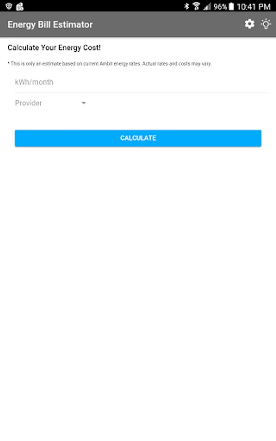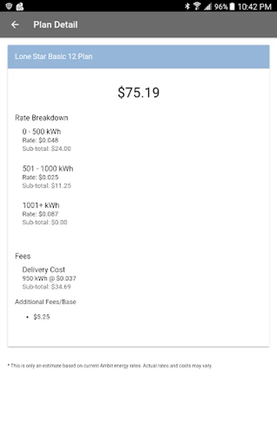 Energy Bill Estimator is an app created to help Ambit Energy consultants quickly and easily estimate the total cost of a residential electricity bill based on price per kilowatt displayed in the current plans.
