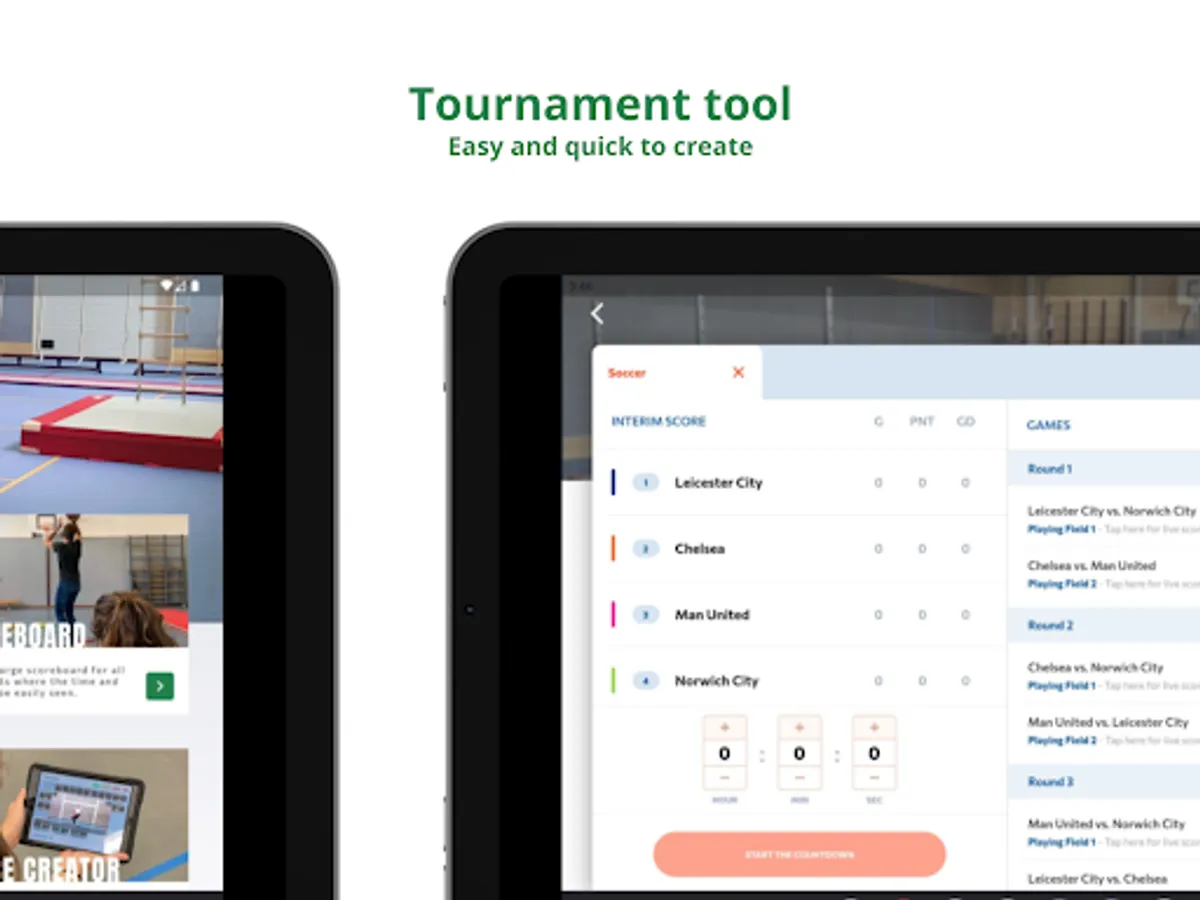 - Tournament tool: Choose a name for your tournament, select your teams, choose between a single or double competition, specify the number of playing fields, and quickly and easily create your tournament.