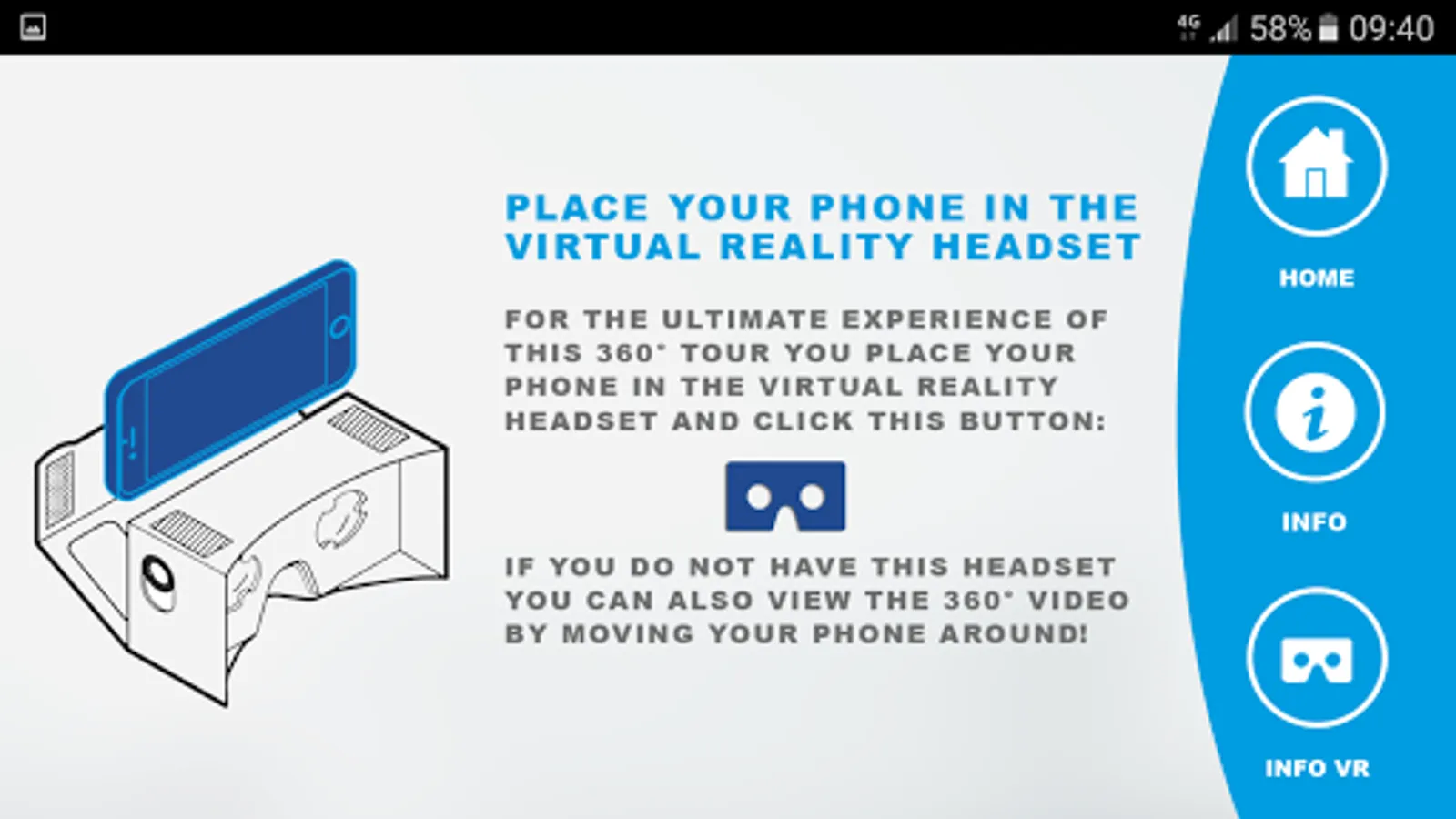 This app is equipped with Virtual Reality mode. Click the glasses icon and place your phone in the virtual reality device, zoals Google Cardboard or other virtual reality devices, for the ultimate experience!