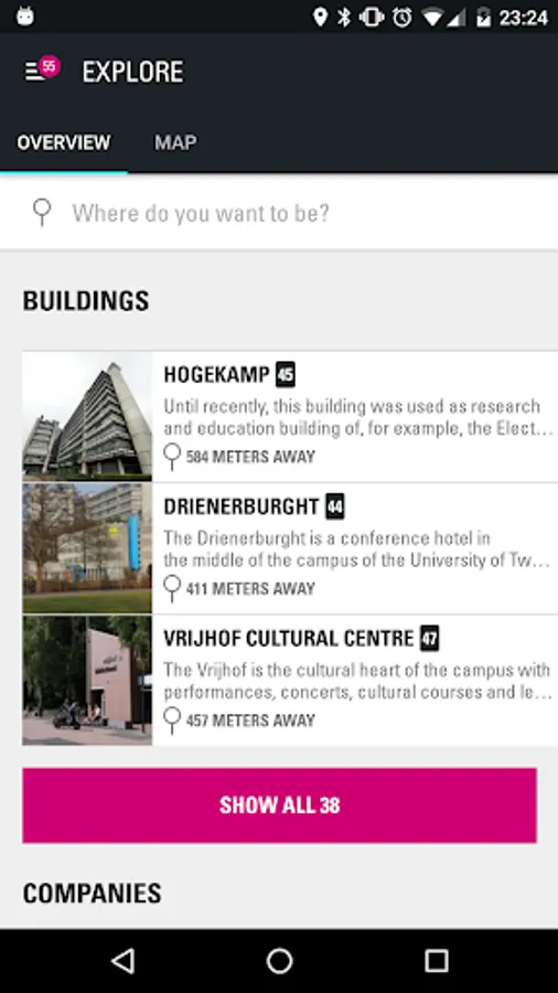The Campus app includes a comprehensive list of points of interest on the University of Twente campus. Looking for the opening hours of the Student Information Centre or the location of that floating sculpture? The Campus app will help you find it.