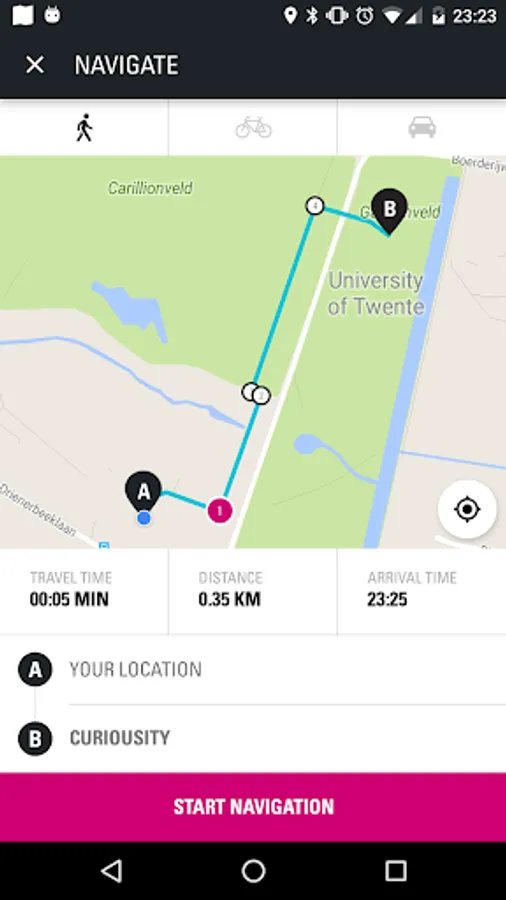 Effortlessly find your way around the campus of the University of Twente. The Campus app guides you to your appointment, the parking spot closest to your appointment or any other outdoors point of interest of your choosing.