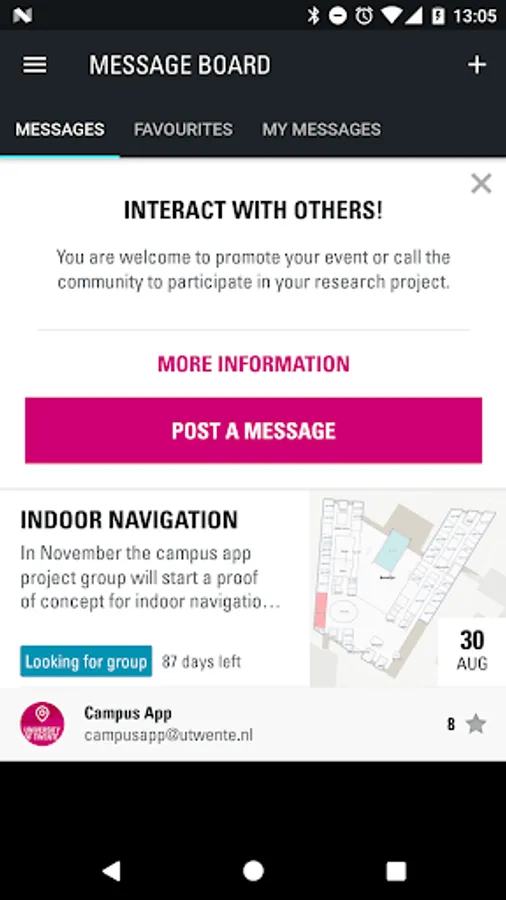 Don’t have a meeting on the campus yet? Don’t worry, the Campus app allows you to explore the campus, see and join upcoming events or post on the message board. If you’re already here, you can even see which events are happening near you right now!