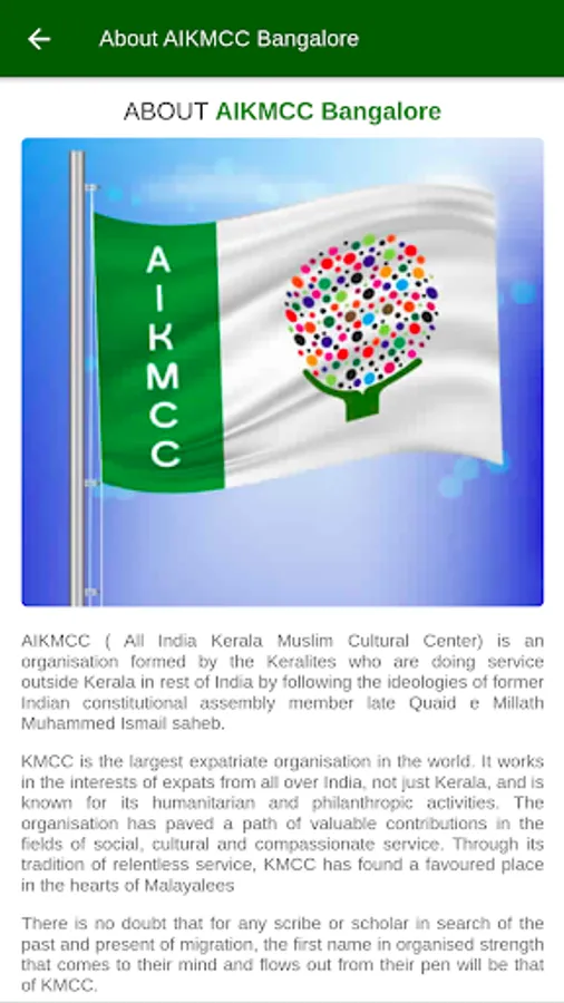 AIKMCC ( All India Kerala Muslim Cultural Center ) is an organisation formed by the Keralites who are doing service outside Kerala in rest of India by following the ideologies of former Indian constitutional assembly member late Quaid e Millath Muhammed Ismail saheb.