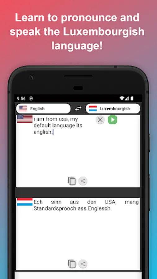 An option to speak is available in the English to Luxembourgish translator app. You can work on your pronunciation in both Luxembourgish and English. We feature voice input and voice output for the greatest pronunciation practice.