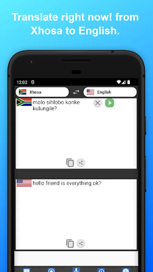 This free text and voice translator is the greatest option if you're seeking for the most effective way to translate from English to Xhosa. Speaking Xhosa has never been simpler thanks to the English to Xhosa voice translator. Now is the time to learn! The unique tool that will make it simple for you to learn Xhosa and translate it!