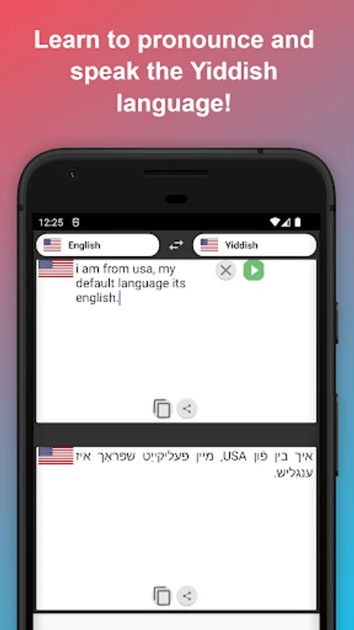 An option to speak is available in the English to Yiddish translator app. You can work on your pronunciation in both Yiddish and English. We feature voice input and voice output for the greatest pronunciation practice.