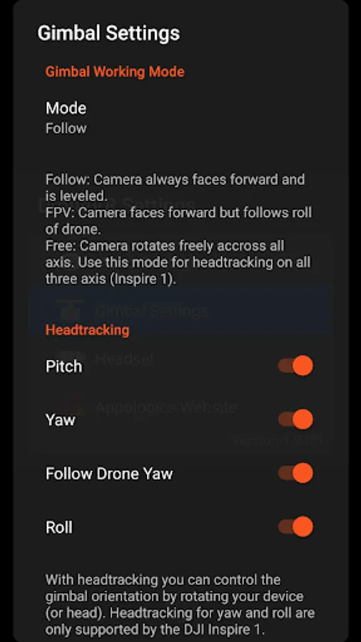 * Head-tracking allows you to controls the orientation of your camera in realtime by moving your head ! For DJI Phantom Series head tracking is supported for camera pitch. With the DJI Inspire 1 head tracking across all three axis is supported.