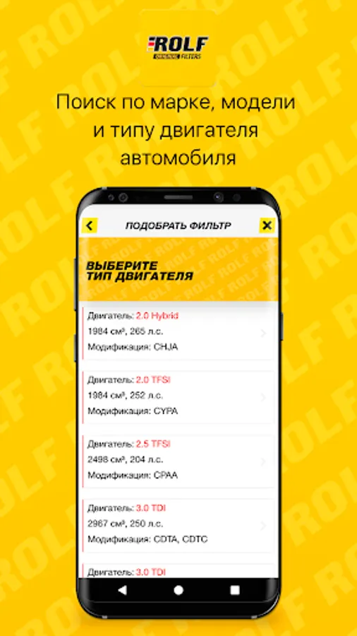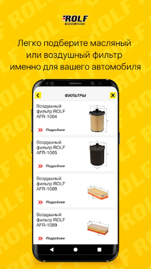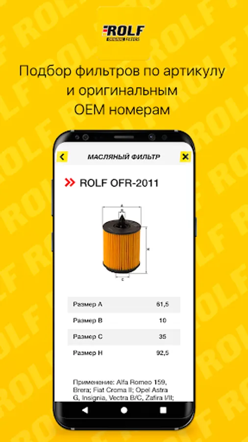 Market filter elements is represented by more than 4000 modifications. This leads to difficulties in choosing the right filter for your vehicle. ROLF application solved this problem. Now, to pick up the oil and air filter for your vehicle, put it quite brand, model and modification. The application will select the best option among a plurality of filters ROLF. There is also a possibility to select filters on the article. The application works not only with the part numbers ROLF, but also selects the most suitable variant for sales numbers for the following brands: FILTRON, MANN FILTER, FRAM, PURFLUX, SCT, as well as factory OEM part numbers. The application will be useful not only to owners of cars, but also professionals stations, as well as sellers of auto parts stores. The application will show a suitable option for a second. It is possible to see the filter settings and other useful information to make the right choice.