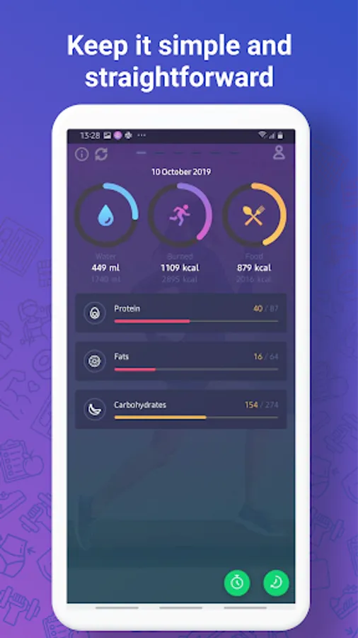 With FitAim, you will always know your indicators: daily data about you and your diet is conveniently presented in the form of daily summaries with simple, clear infographics.
