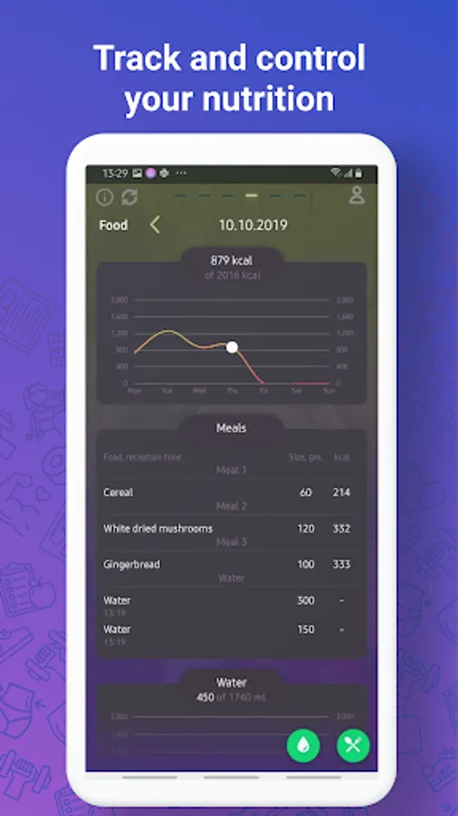 Now you don’t need to remember what you ate for breakfast! More than a hundred predefined types of food and the ability to add your own, accounting nutritional and energy values, controlling the body's water balance. Visual charts will help you learn more about your diet!