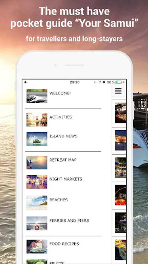 All you need for a perfect holiday or life on the island: attractions, restaurants, hospitals, markets... Application gives all details and information about island and Thailand such as fruits, food, vocabulary, holidays, weather, beaches, laws, visas and even more.