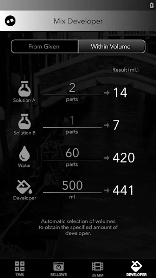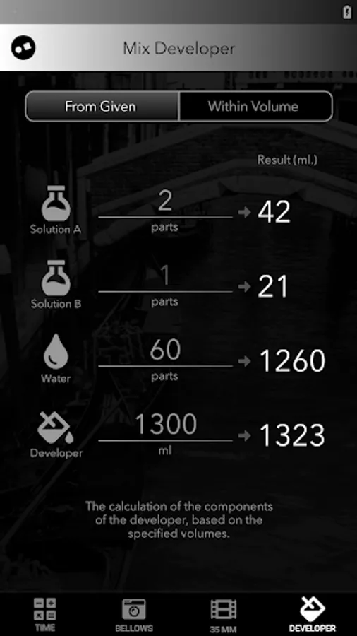 Calculator of developer and water proportions for High concentrate film developers such as pyro.
