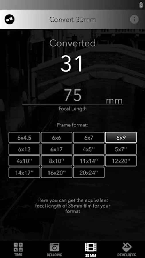 Conversion focal length of the medium and all famous large format cameras lenses into the 35 mm format.