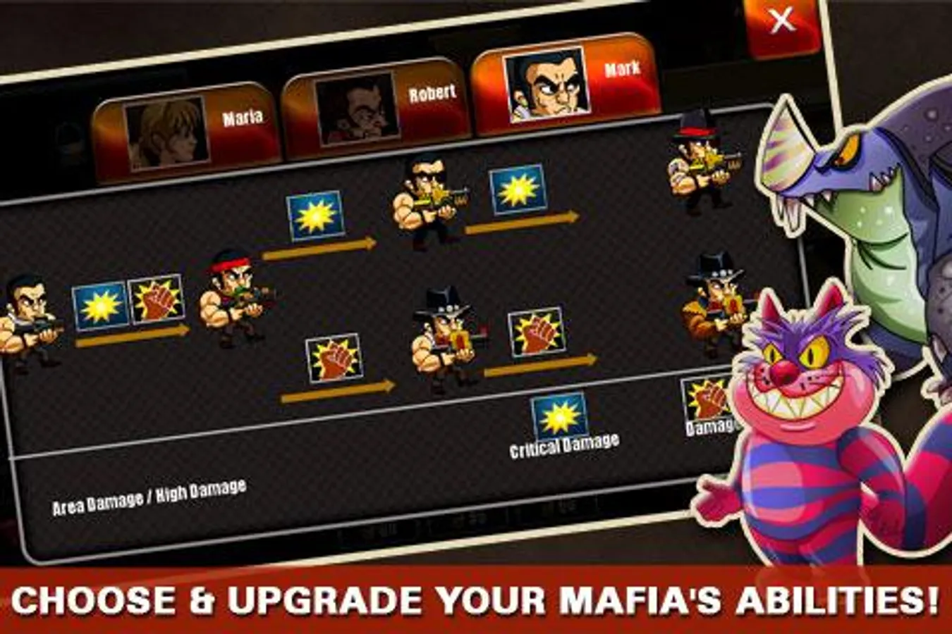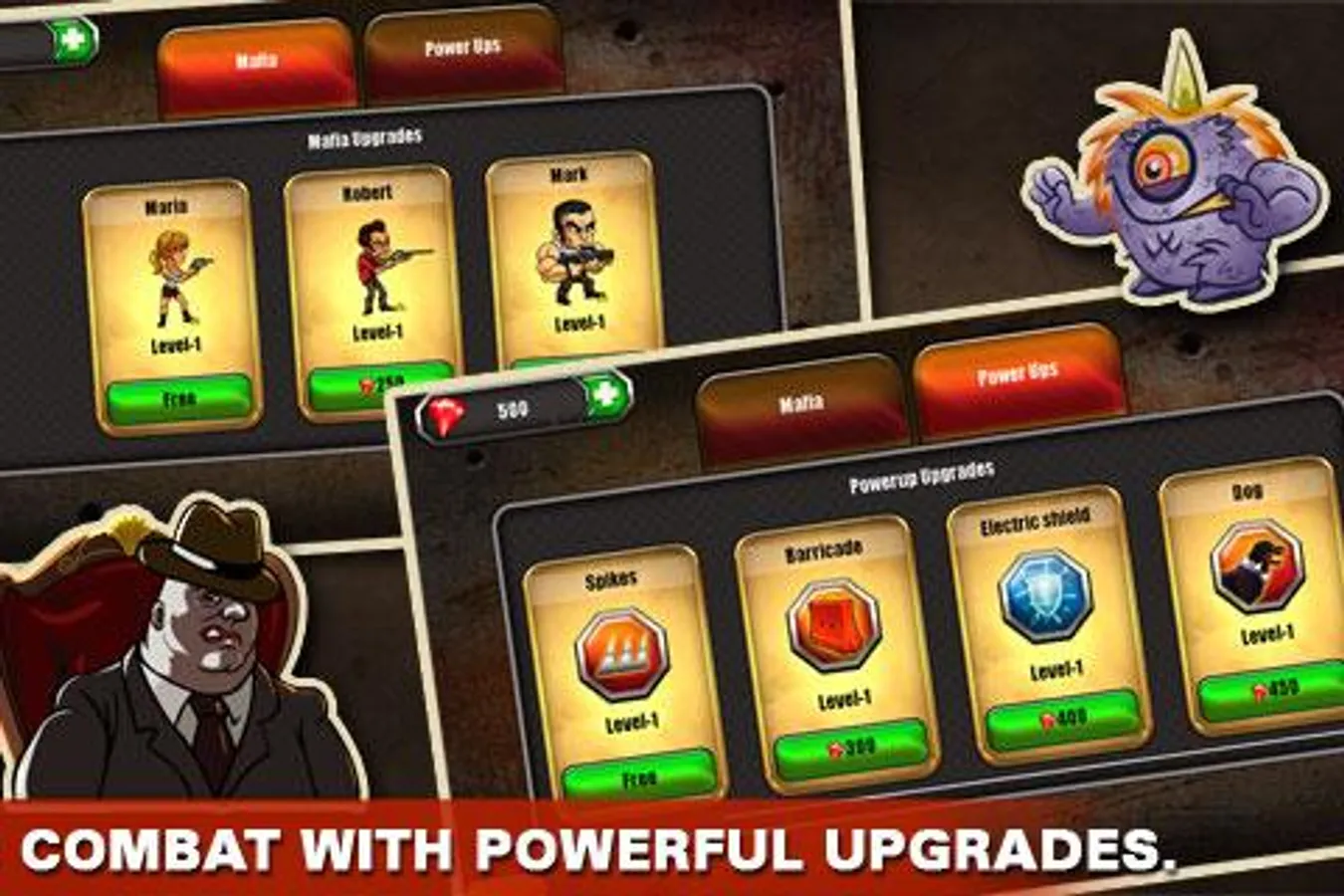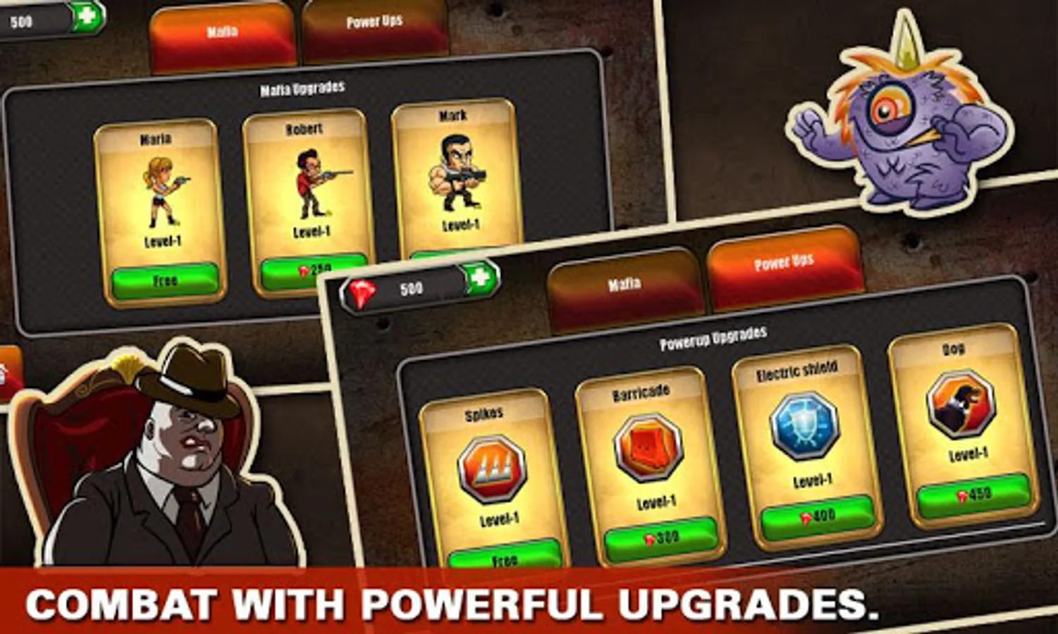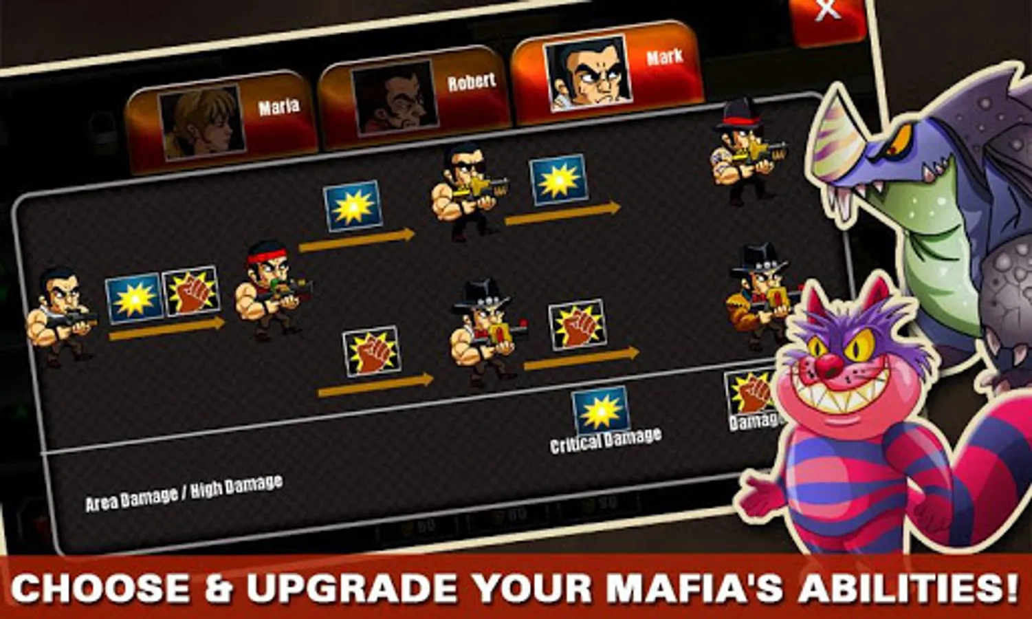 Upgrade your mafia team to contra monsters, and equip them with more powerful weapons and powers