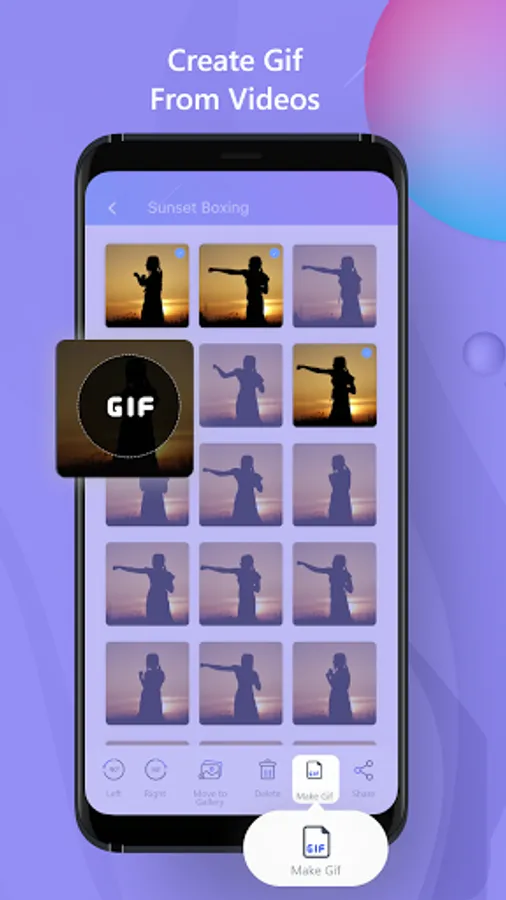 - Captures images from video. Videos can be from your mobile phone camera or downloaded from the internet.