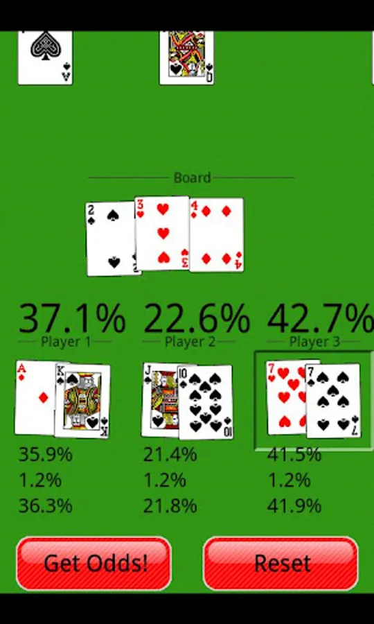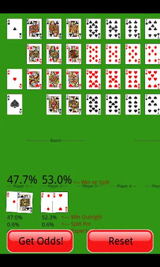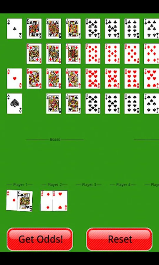 - press "get odds" to calculate. or "reset" to clear all card areas.