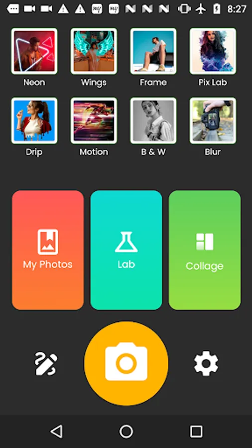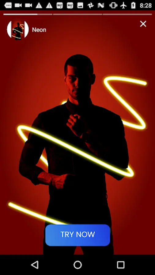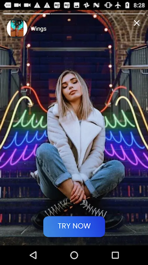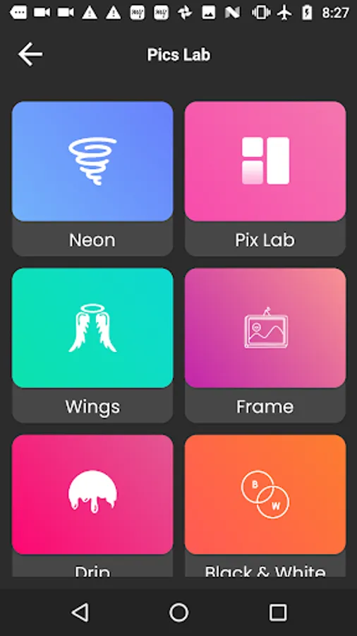 Neon effect - Wing effect - Overlay effect - Filters - Motion effect - Mirror effect - Splash & Blur effect - filters - effects and stickers" that help you create an eye-catching image.