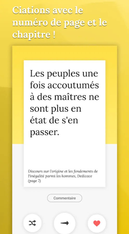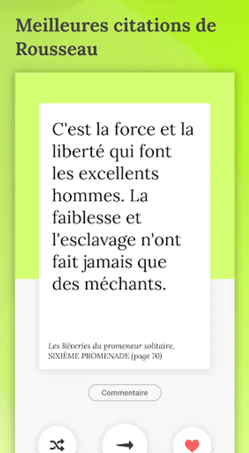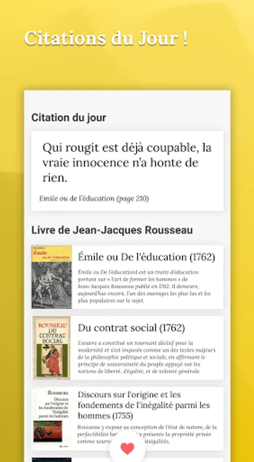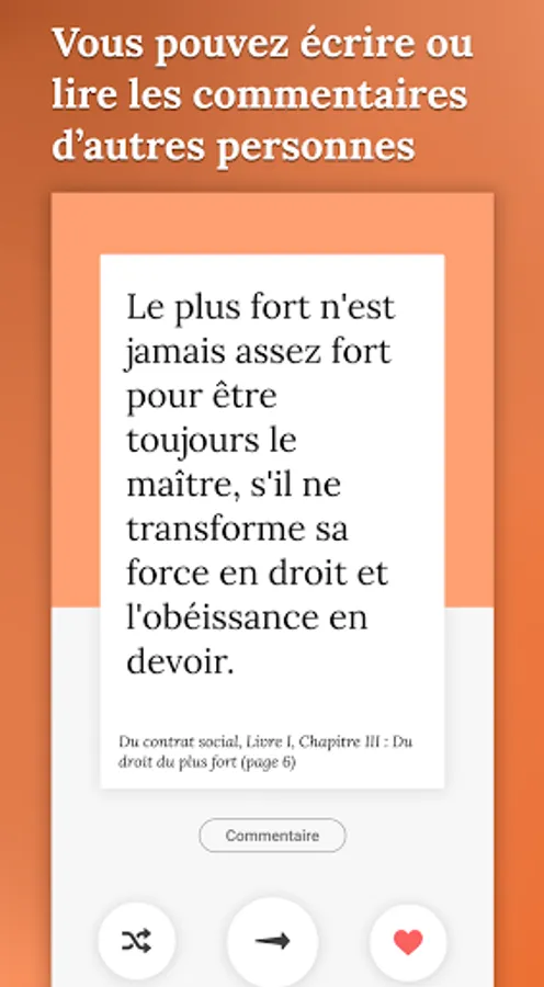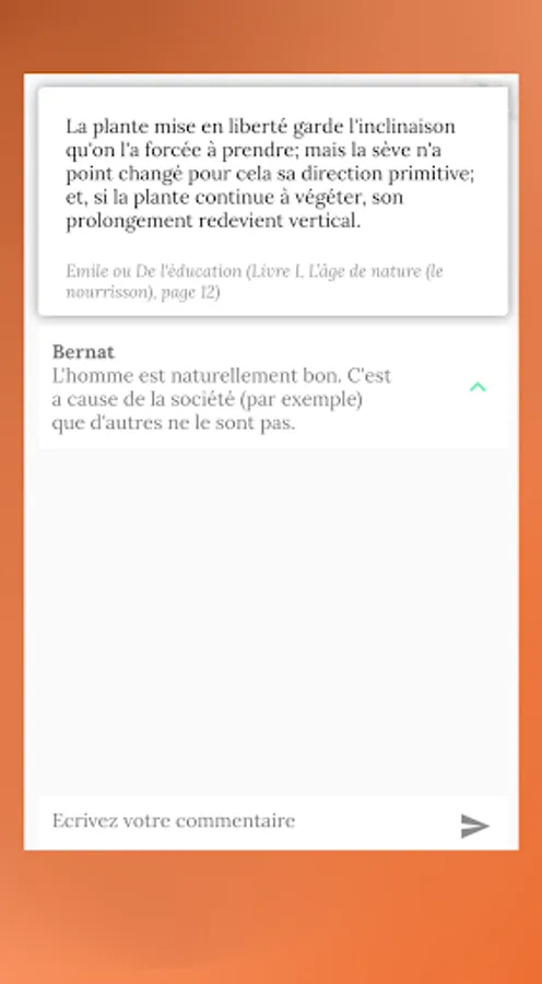 The best quotes from Jean Jacques Rousseau, with the page number of the quotes, the chapter where the quotes are located. There is also the possibility to write commentaries / analyzes of the quotes accessible by all other users.