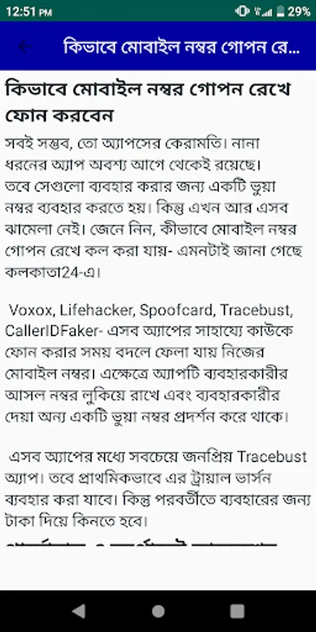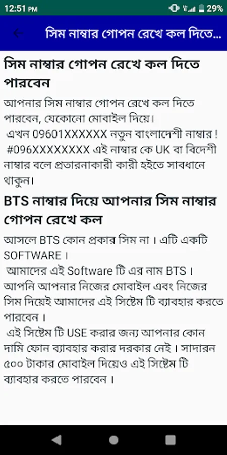 সিম নাম্বার গুরুত্বপূর্ণ একটি বিষয়।সিম নাম্বার গোপন রেখে কল করুন খুব সহজে।তার জন্য এই এপটি ব্যবহার করতে হবে।আপনার সিম নাম্বার গোপন রেখে কল দিতে পারবেন, যেকোনো মোবাইল দিয়া।তার জন্য এপটির সকল নিয়ম সঠীকভাবে পালন করতে হবে।