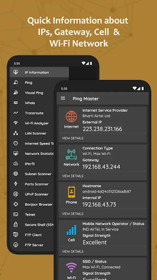 ✔ Gives IP Information including external IP, Gateway IP and Internal IP.