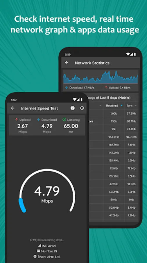 ✔ Network Statistics with real time network usage graph with download & upload speed and apps network data usage.