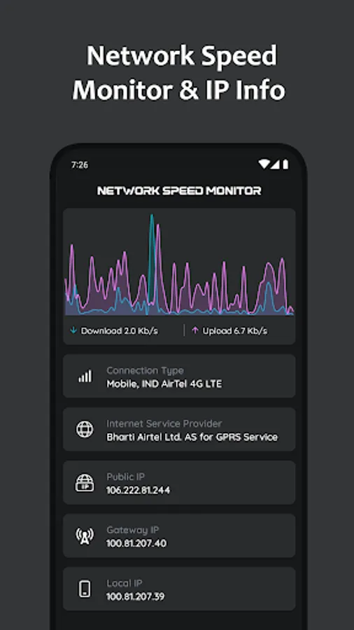 Network Speed Monitor display real time network graph along with connection and IP Information.