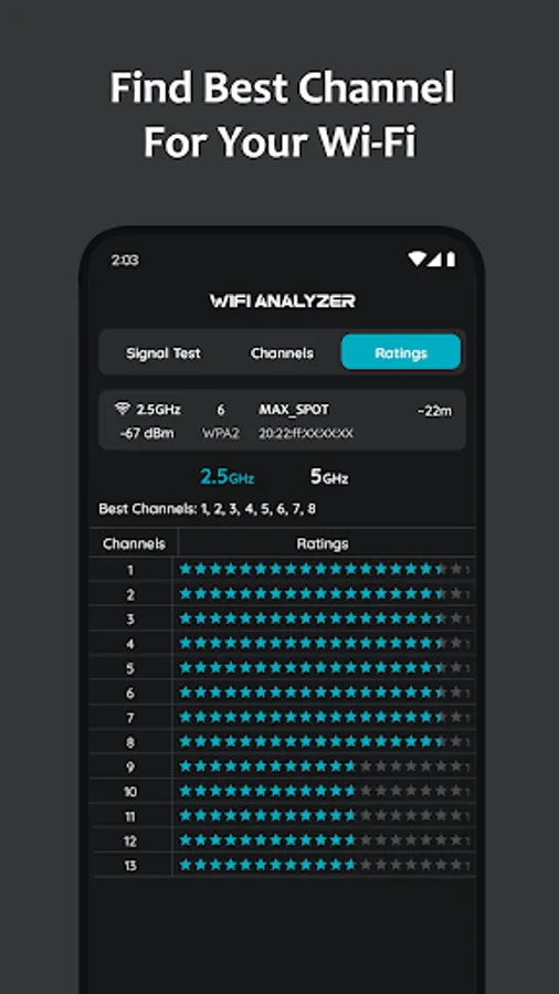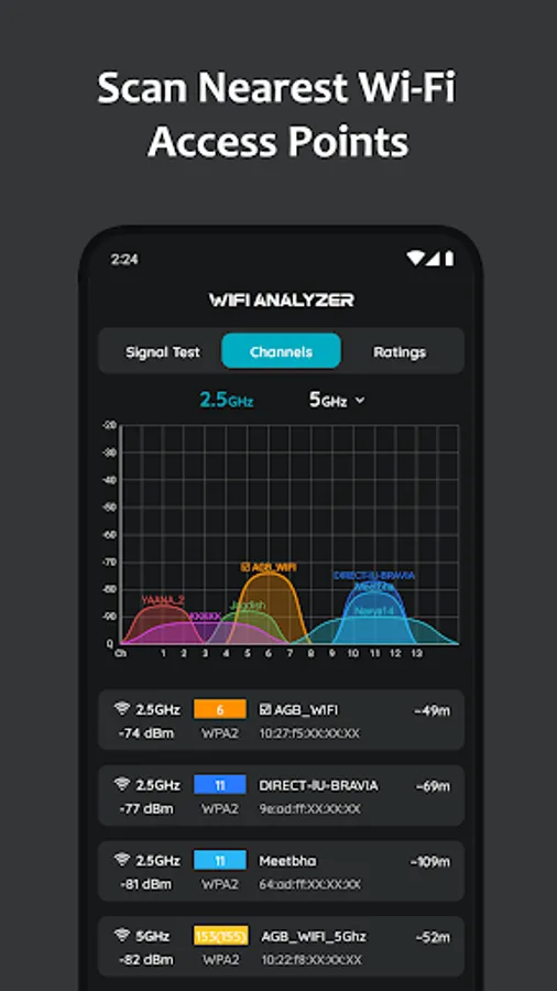 Wifi analyzer tool help you to optimize your wifi network. it has features like wifi signal speed test, scan wifi access points available near to you, real time channel graph and channel ratings.