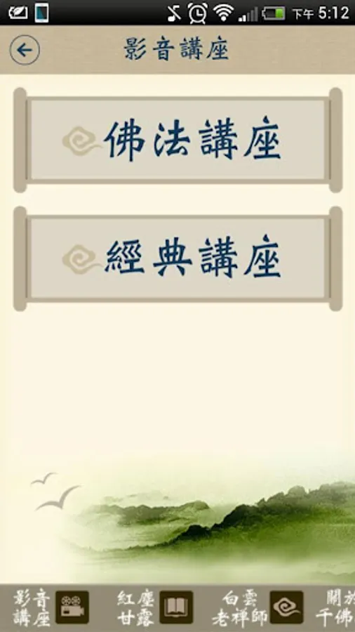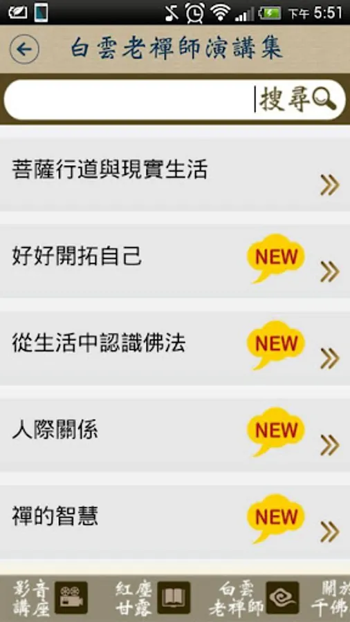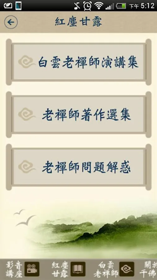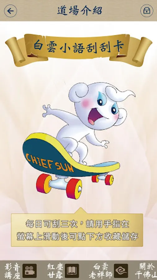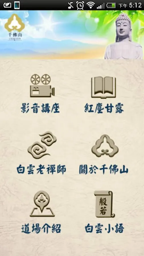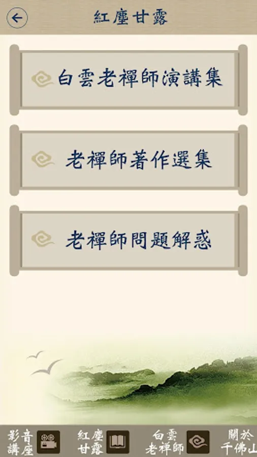 「白雲禪師講座」App內容豐富,包含了「影音講座」、「紅塵甘露」、「白雲老禪師介紹」、「關於千佛山」、「道場介紹」、「白雲小語」六項功能,簡介如下。