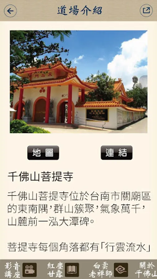 「道場介紹」-即時提供千佛山各道場活動與課程訊息。心動不如馬上行動,經由導航工具的幫助,簡單輕易上手,隨時可親近道場,沈澱身心,充實精神食糧。