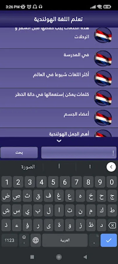 Learn Dutch language easily and quickly with our new free application that provides you with the best simplified lessons in Arabic to learn Dutch in a few days of continuous and consistent use. Simple but effective explanation to Dutch grammar rules with examples and Dutch Arabic translation. Learning new languages has never been easier. Learn a new language at home today, and study Dutch without a teacher if you're interested in the language or you plan to visit the Netherlands.