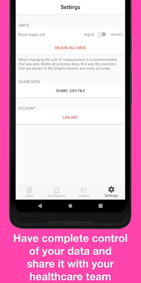 * The option to share your data with your health care team easily in a CSV format from which your physician can filter and sort the data any way they please