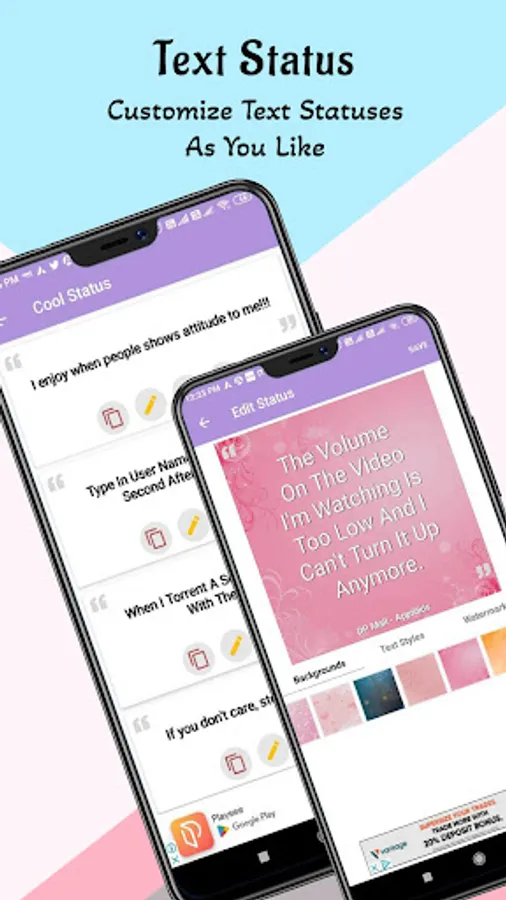 Write on Photos : Write Status on Photos. You can add text, change text style, No Watermark option is also available. Status can be copied, shared and saved as image with the background of your choice.