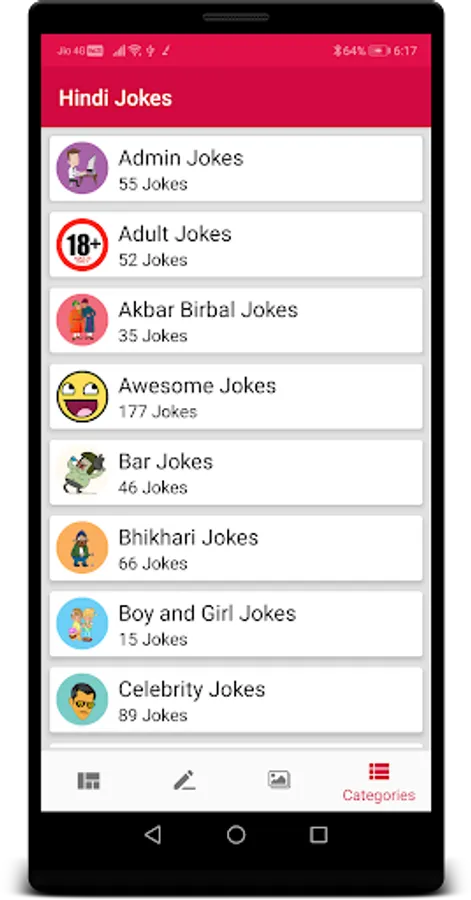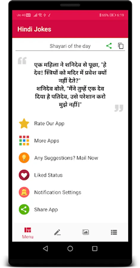 Hindi Jokes can be shared with your WhatsApp Friends, Facebook Friends or any other social network friends. Hindi Jokes apps has thousands of funny images and text jokes.