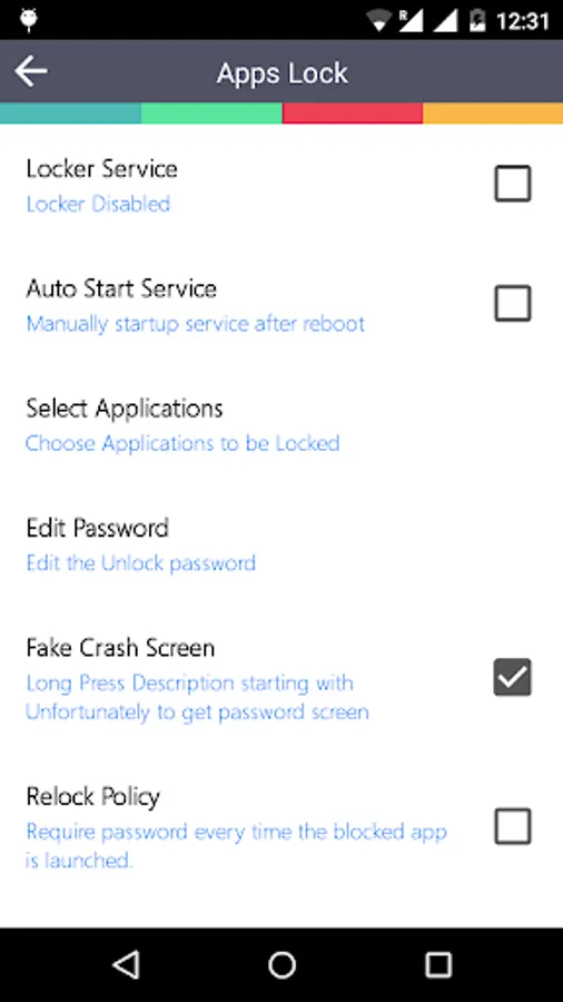 ** FAKE CRASH SCREEN :- Lock applications with fake crash screen. When some one tries to open an application you have locked. It will show a fake crash screen titling "Unfortunately application has been stopped". After Long press this title you will get password screen to enter your private application.